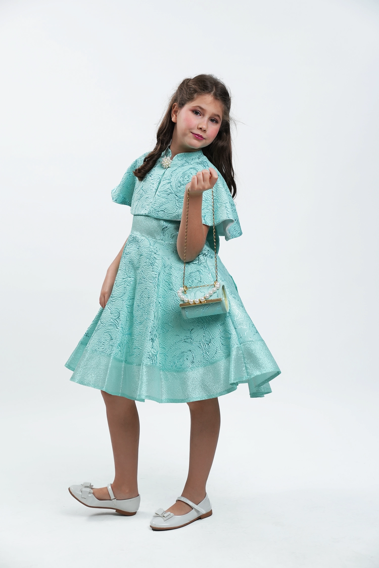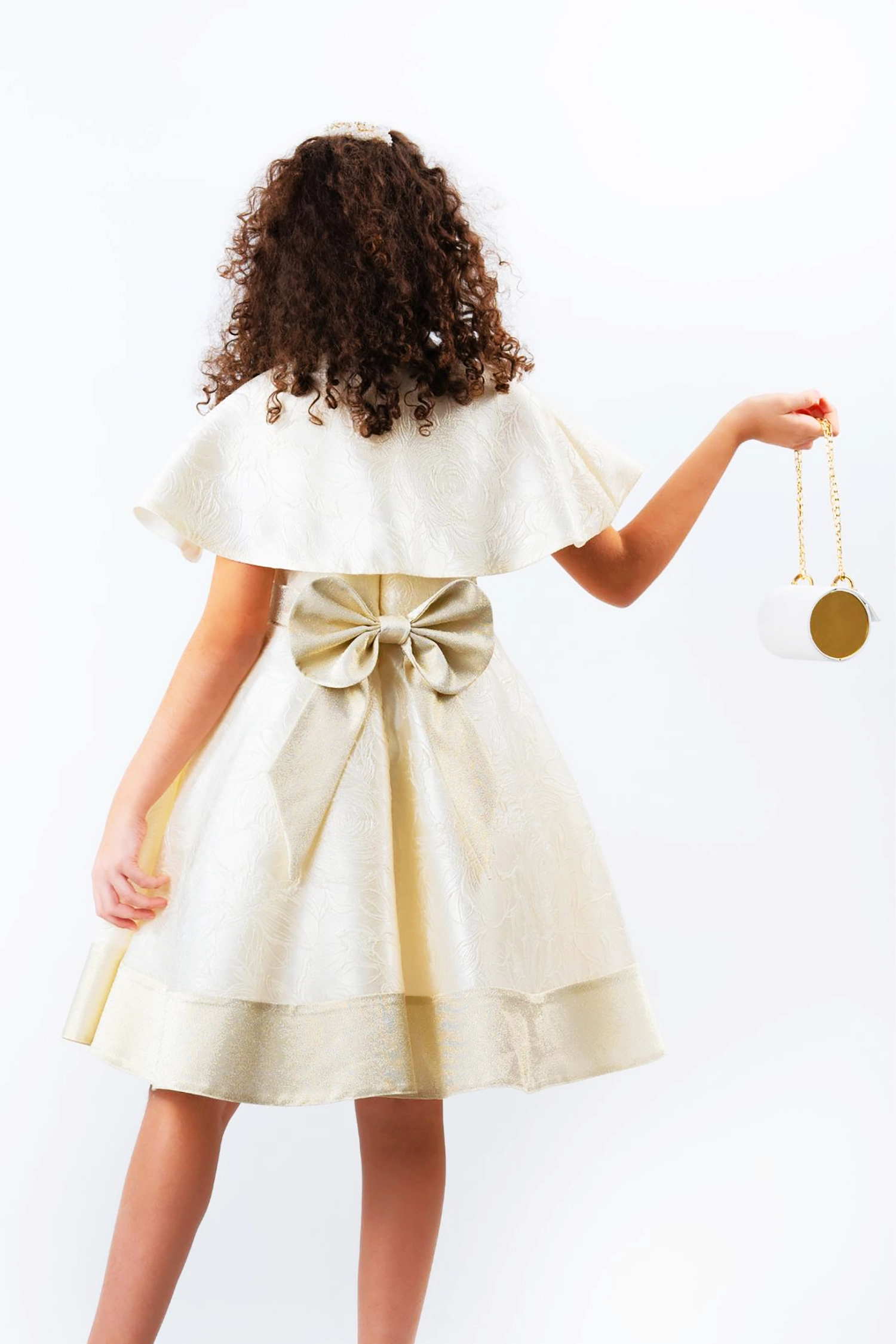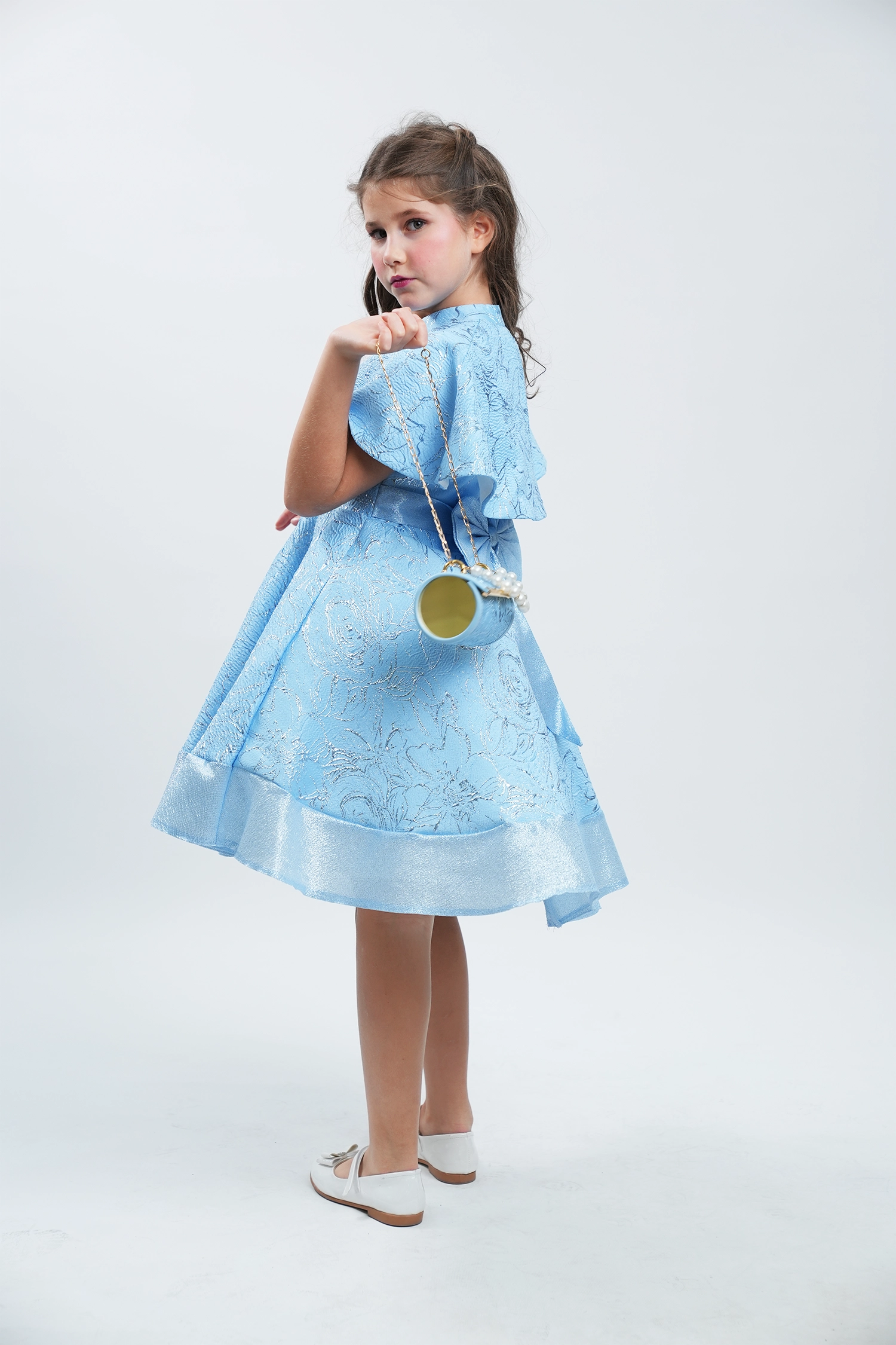 This glittery jacquard dress is sure to turn heads at any party or festival! Inspired by British princesses, it’s made from luxurious jacquard fabrics with soft graphics that shine through.