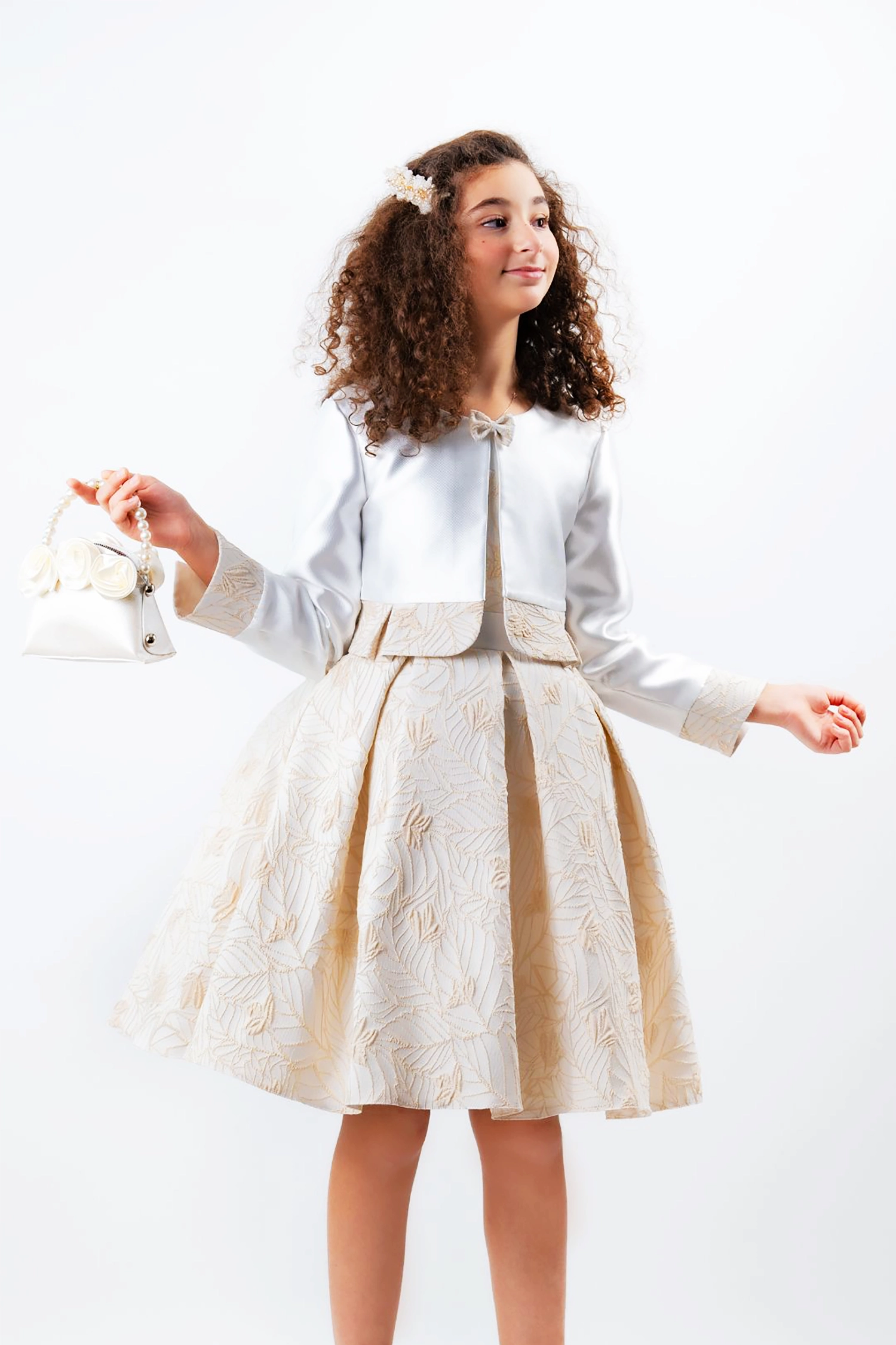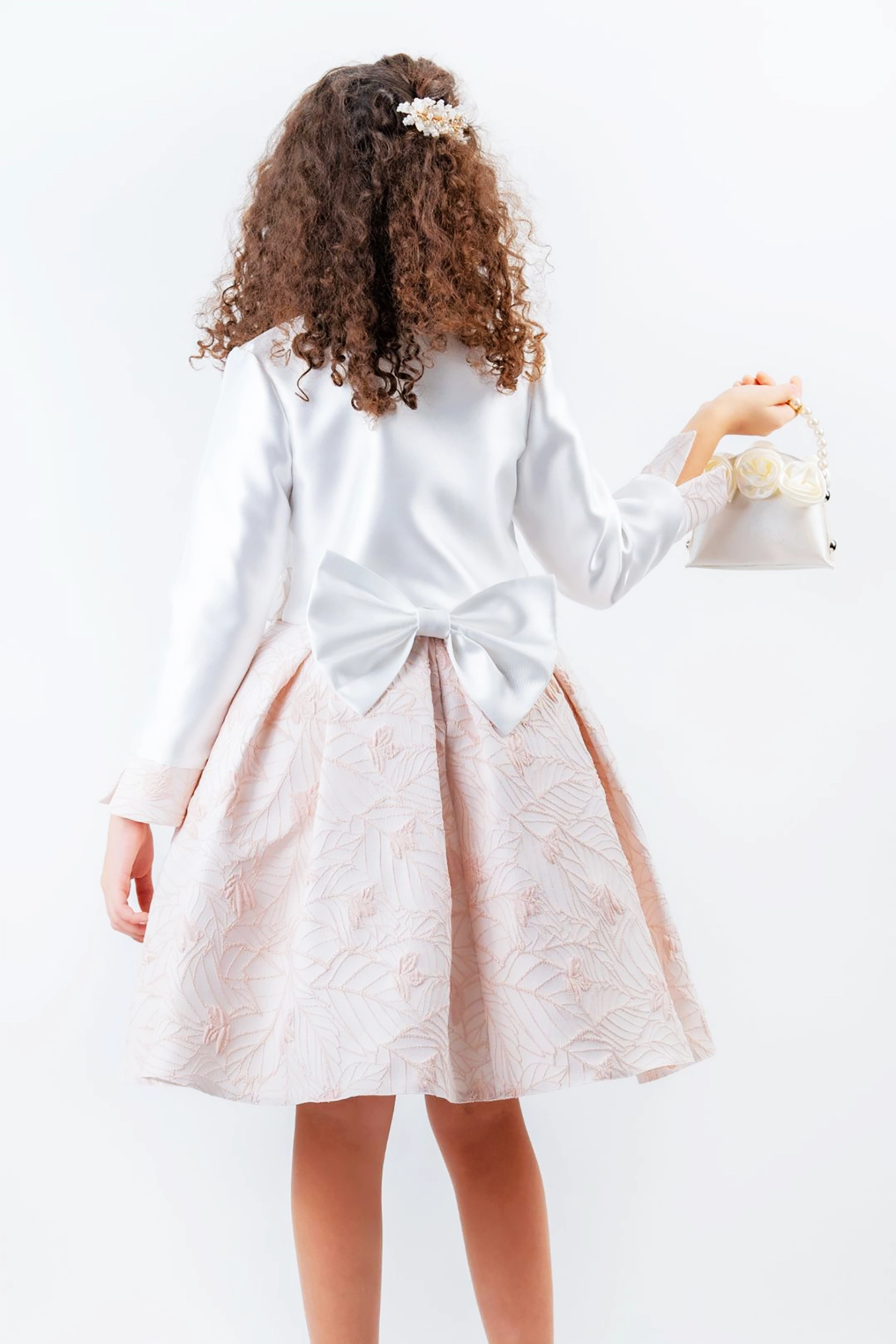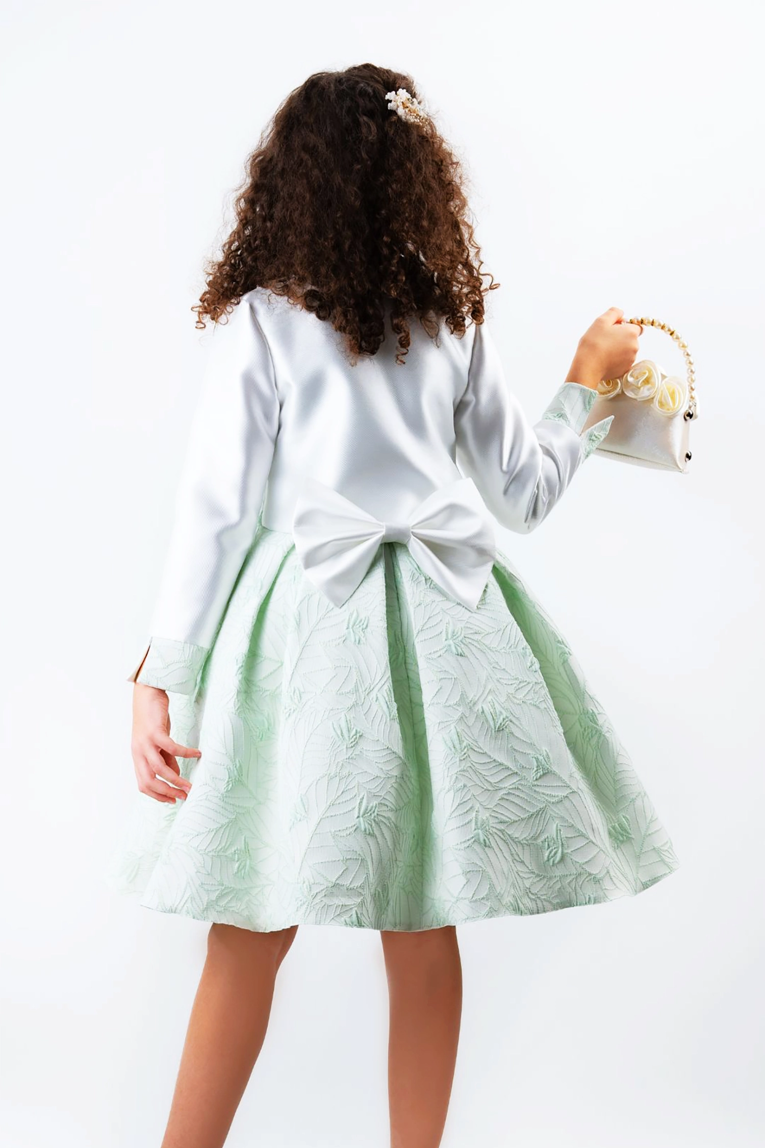 The soft jacquard fabric and elegant multicoloured graphics make this dress perfect for holidays and formal visits. The dress is finished with a shiny mikado fabric that adds a touch of luxury.