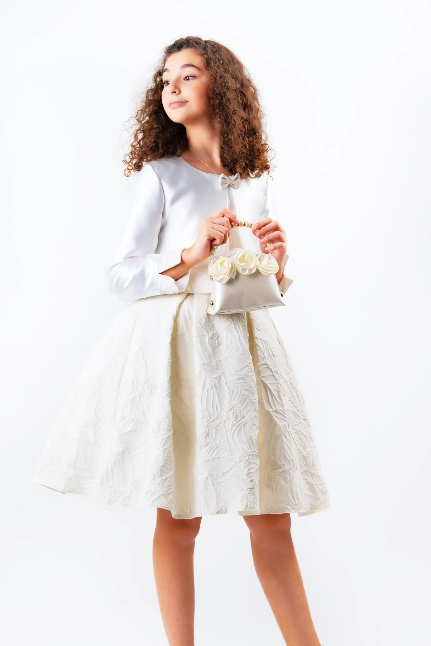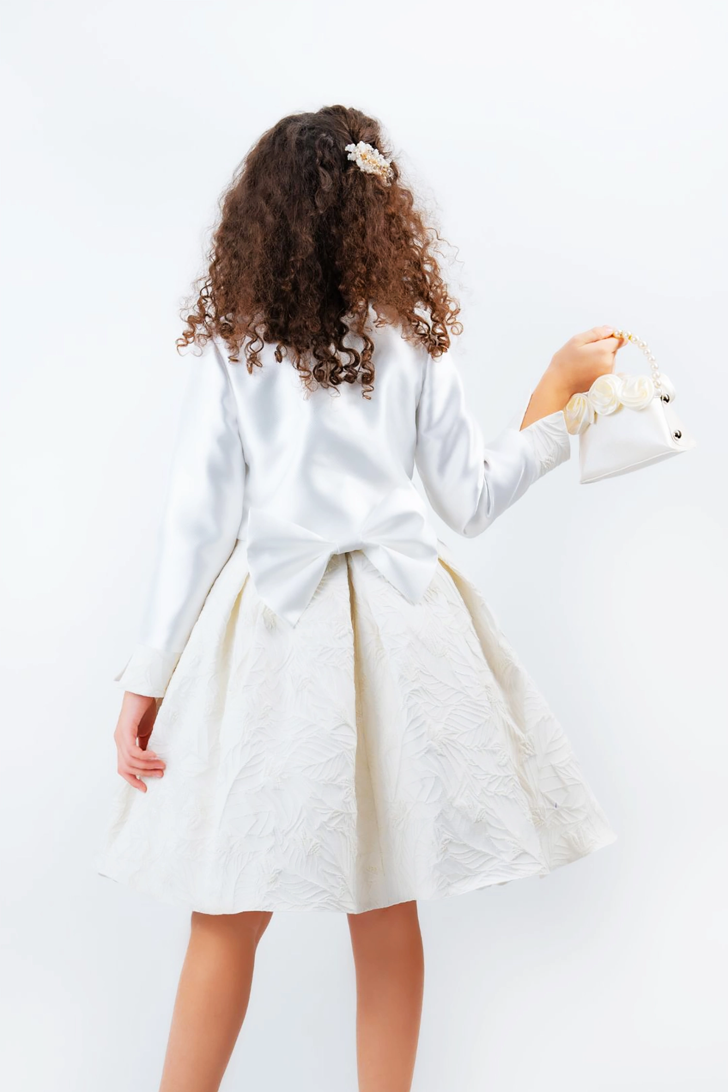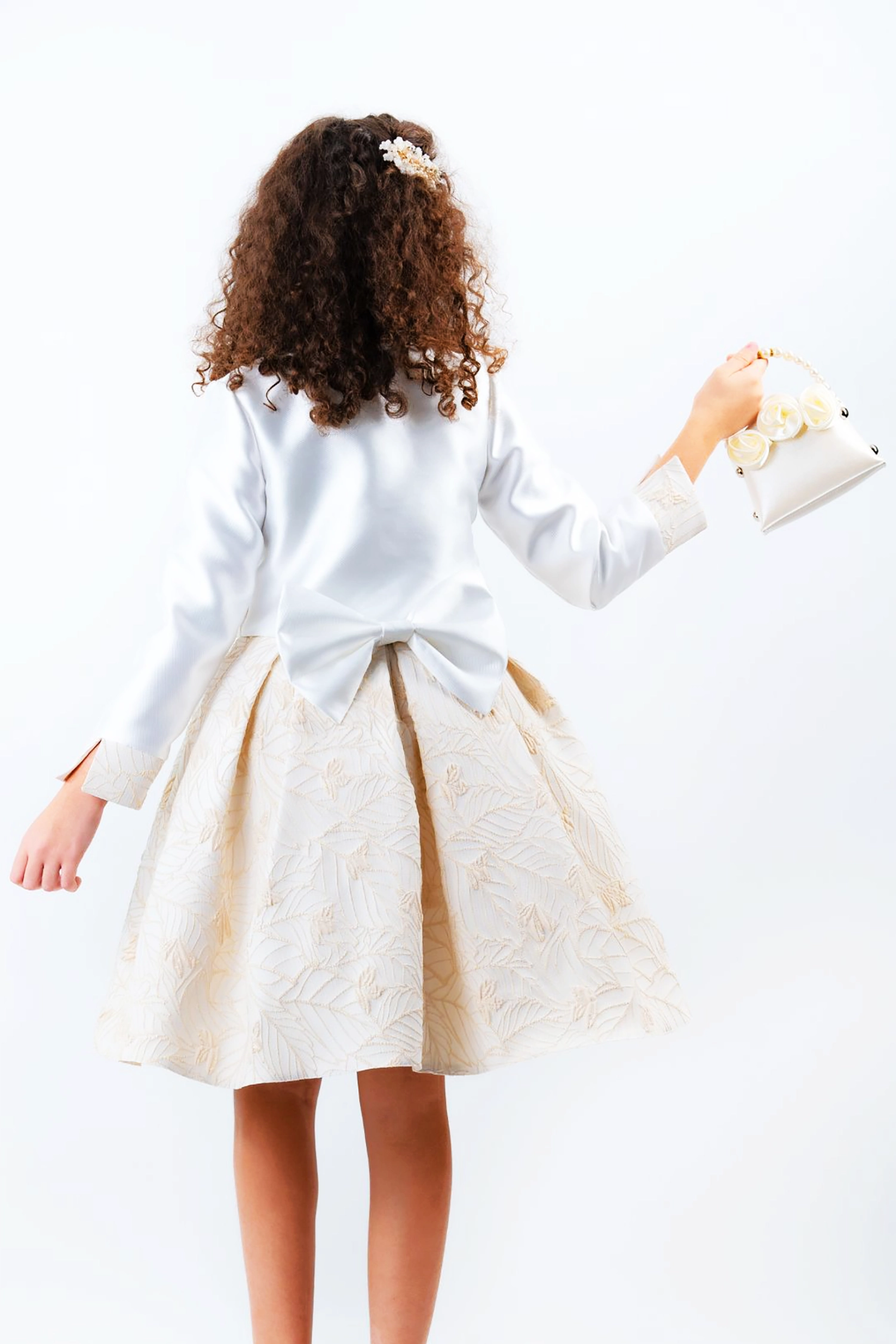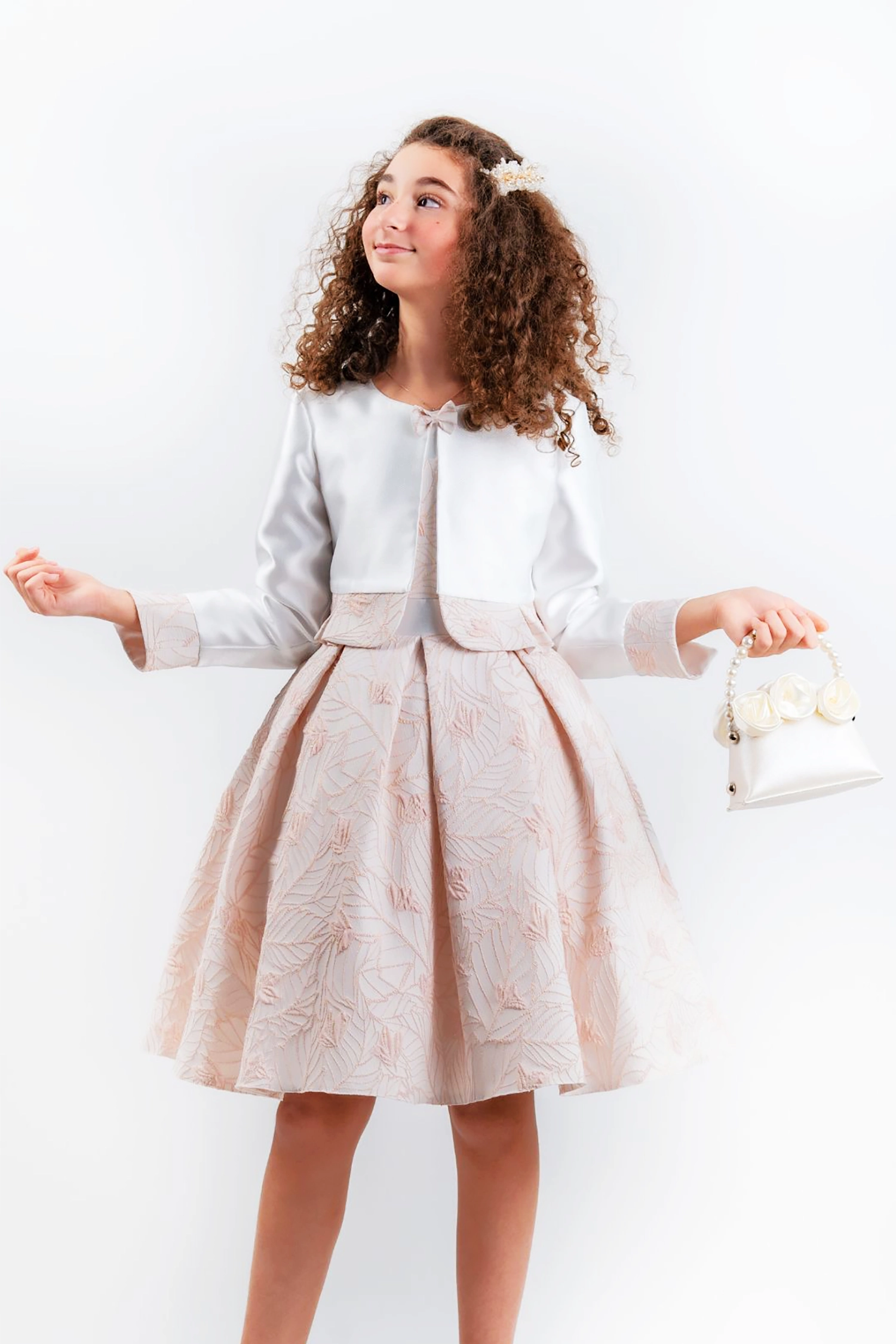 The soft jacquard fabric and elegant multicoloured graphics make this dress perfect for holidays and formal visits. The dress is finished with a shiny mikado fabric that adds a touch of luxury.